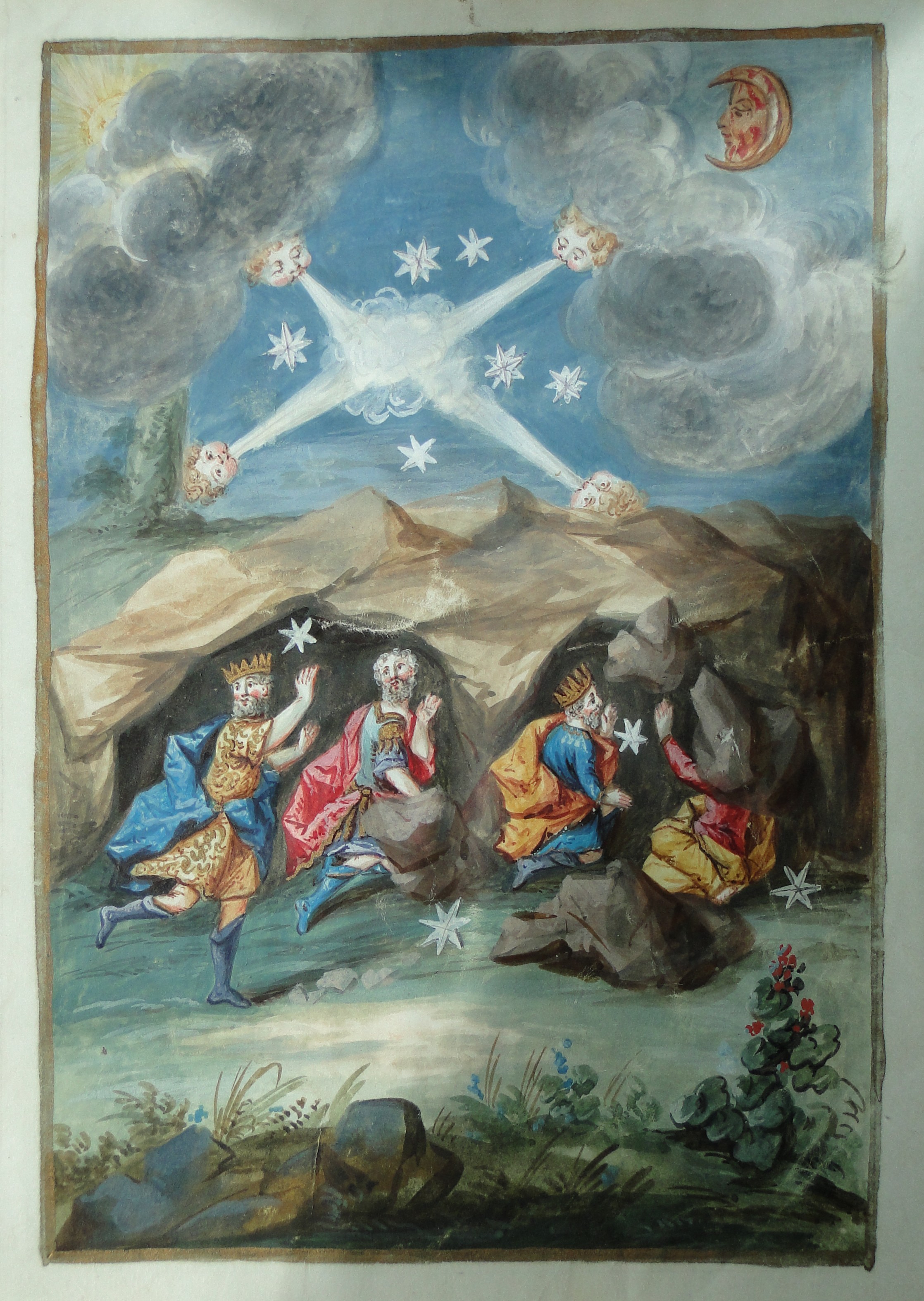 ms38190 is a French manuscript of the early 18th century, containing Philosophorum Praeclara Monita (The most renowned maxims of philosophers), an anonymous alchemic tract written in French and Latin. It contains forty eight allegorical illustrations in colour from various earlier works.