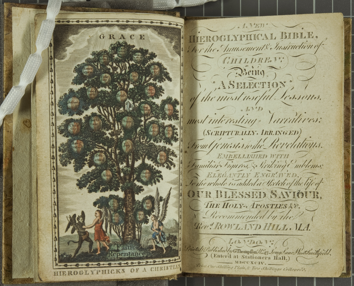 Hieroglyphic Bibles became en vogue in late 18th century England as a means for teaching Bible stories to a new audience: children from poor and working-class families. They came on the heels of the changes being made to the education of children in Industrial Revolution England and on the need to improve quality of life and crime rates amongst factory and farm worker’s children. Robert Raikes, a Gloucester philanthropist and editor of the Gloucester Journal, saw the opportunity of opening a school on Sunday (the only day on which the Industrial Revolution’s children would not be working) and began teaching children how to read and write using the Bible. The Sunday School movement became very popular and by the 19th century hundreds of thousands of children across England were receiving education never before available to them.