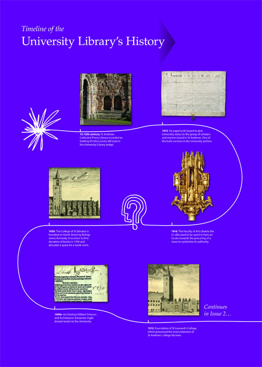 Each issue of 600 Years of Book Collecting features a full chronological listing of the entire series, and each issue also features a part of a visual timeline of the University Library’s history. This series brings together the clarity of modern design and the inherent beauty of the Library’s strongest asset — its books. At £3 each, these beautiful magazines are a beautiful introduction to the University Library’s holdings and a great way to get excited about the Library and the University of St Andrews, recently named Scottish University of the Year 2014.