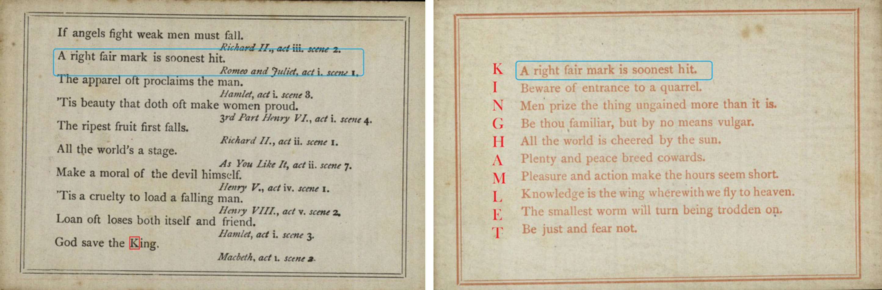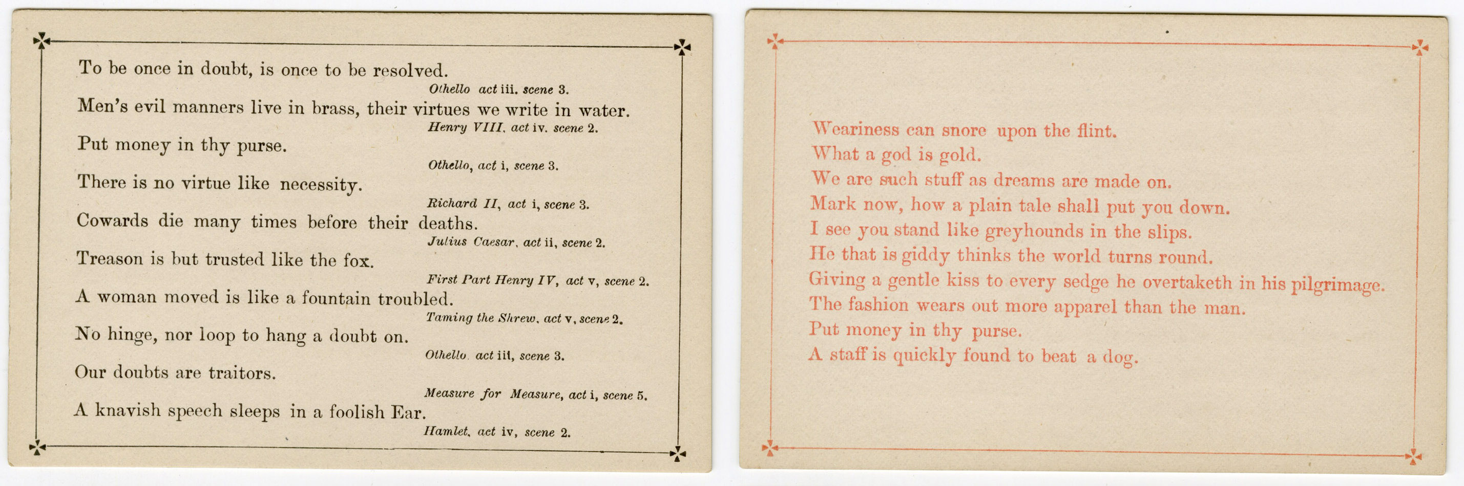 Our copy of The new Shakesperian puzzle is itself a bit of a mystery. It is a London edition, published by an ‘F. Passmore’ who appears to have been a stationer and novelty-item seller in Cheapside. Various references to the puzzle in 1890s newspapers indicate that it was probably produced and sold in that decade. It seems to be a later edition of an 1880 puzzle which was published in New York by Robert Gair, an Edinburgh-born printer who invented the pre-folded cardboard box and founded a Manhattan ‘paper empire’.