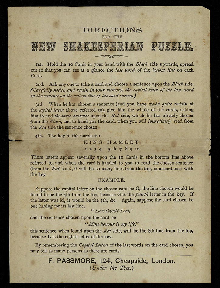 ‘Startling Novelty!!!!’, declares the envelope. It contains a Shakespeare puzzle which promises to ‘enable a person to tell the thoughts of half a dozen or more of his friends’. We were intrigued!