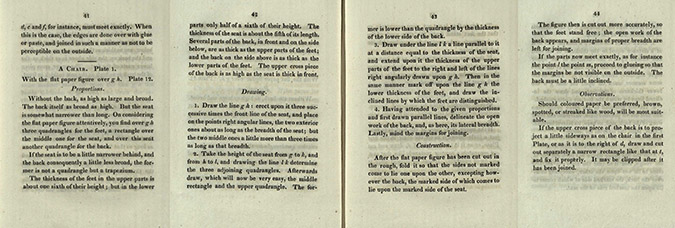 The work itself is set out methodically. It begins with preliminary requisites and directions, describing how the drawing is undertaken (with a pair of compasses, brass ruler, and ruler in the shape of a triangle), the cutting (with scissors or penknife), the folding (where particular attention should be paid to ensure in a straight line), the joining (using glue, gum arabic, paste, or wafers – sadly not the edible kind, but ones which were converted in to a kind of paste when properly wetted), the thickness of glue (to be like the white of an egg), the painting (to be performed in the usual way with brushes of an appropriate size to the cut paper), the thickness of the paper (it should be strong, stiff, and very smooth), before ending with the directive that “objects ought not to be represented on too large or on too small a scale.”