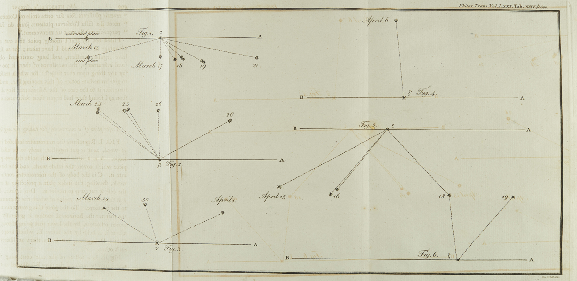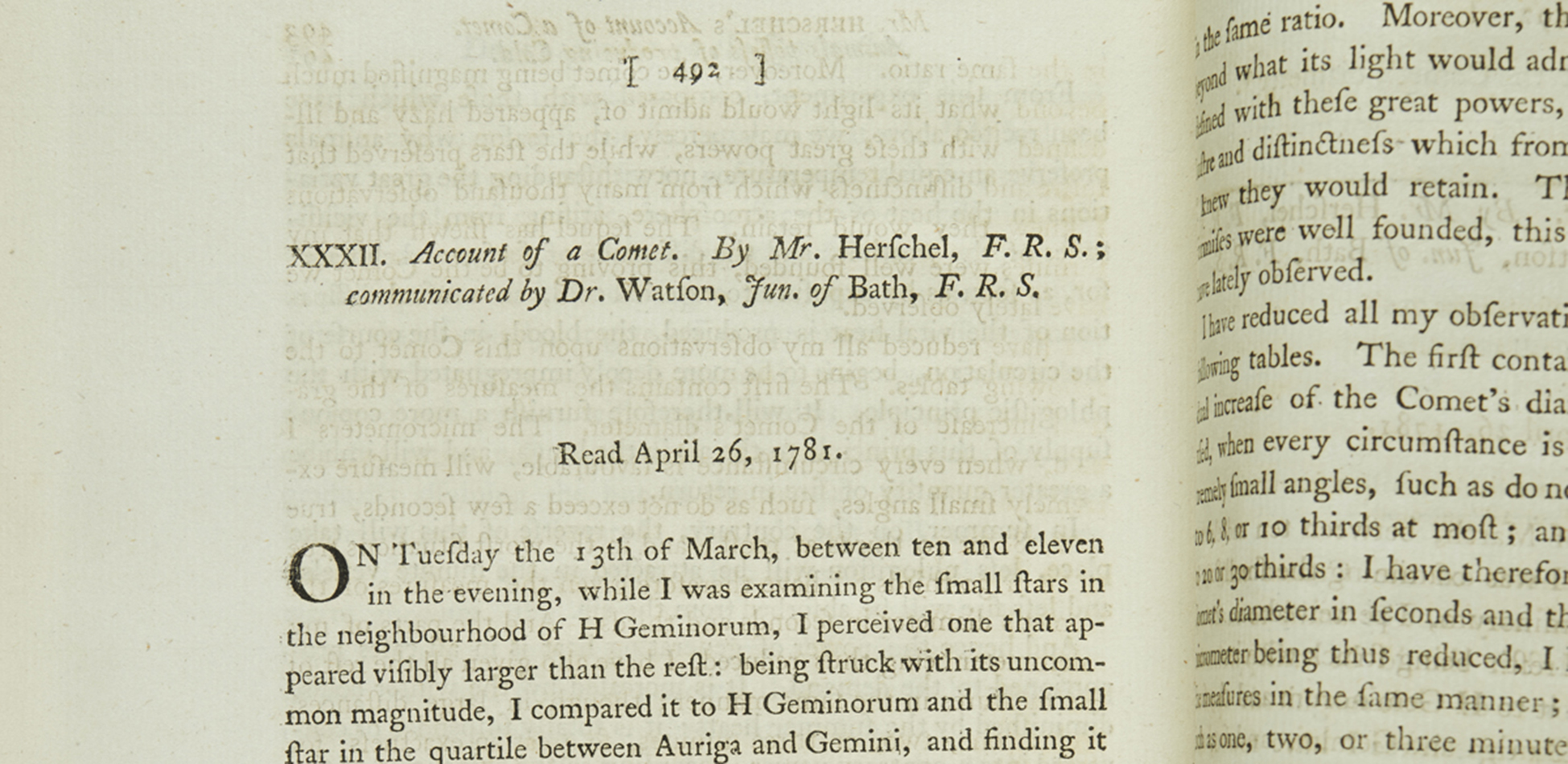 The next planet in our solar system to be discovered was Uranus, first observed by William Herschel in 1781, first thought to be a comet and then later confirmed as a planet. His initial findings were read before the Royal Society and published in the Society’s Philosophical Transactions in the same year (you can find a pdf of the original piece here).