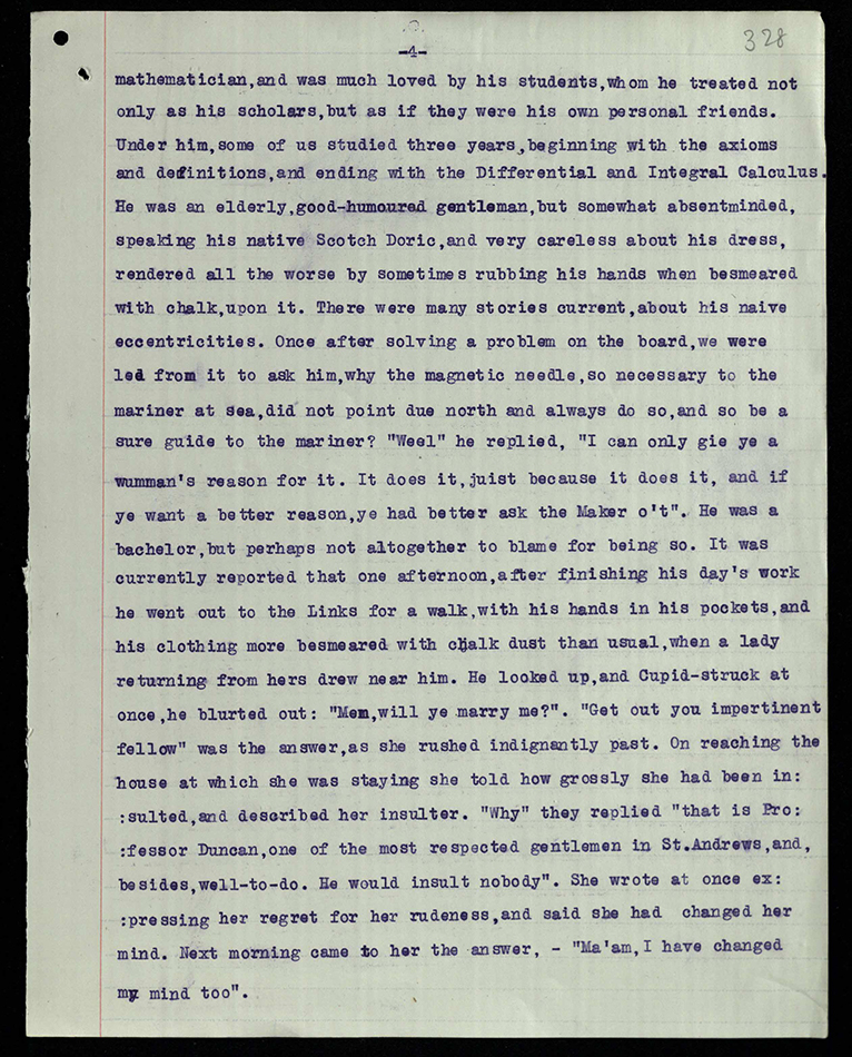 As I read affectionate descriptions of outstanding academics, I kept coming across stories with slight variations about Thomas Duncan, Professor of Mathematics. So, since I knew little about Duncan, I thought I would try to see just how much of a personal nature I could glean about the man from the box files. But first I would do the standard digging in the archives to see what could be established from the ‘normal’ sources, and then compare the two.