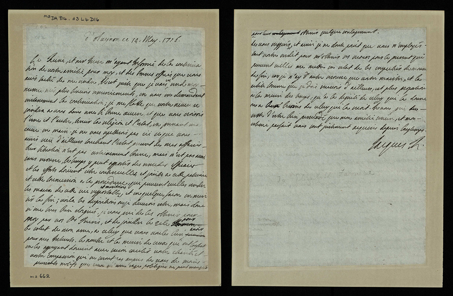 Autograph letter, James Francis Edward Stuart (1688-1766), customarily styled Prince of Wales or the Old Pretender, to an unknown recipient (msDA814.A3L4D16 [ms662, ms663]).James himself left for France in February 1716 and the Jacobites disbanded. This letter from our manuscript collection was written by the Old Pretender, signing himself ‘Jacques R’. It is dated from Avignon in May 1716. He was not welcome in Paris since Louis XIV had made peace with England in 1713. He subsequently moved to Bologna before settling in Rome where he married in 1719. His son Charles Edward Stuart (Bonnie Prince Charlie or the ‘Young Pretender’) was born in 1720.