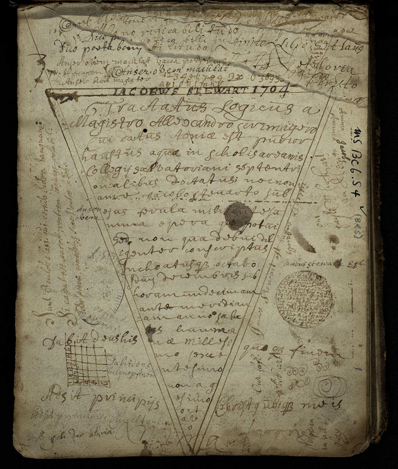 Notes from the dictates of Alexander Scrimgeour, regent of St Salvator’s College, University of St Andrews, taken down by James Stewart (msBC6.S4 [ms173]).One of the University’s staff, Alexander Scrimgeour, was suspended from his Chair of Ecclesiastical History due to his Jacobite sympathies. These lecture notes were taken down from his dictates when he was a regent in the University earlier in his career. The University was clearly conscious of its public position, although the Senatus minutes have a gap from the vital period in 1715-16.