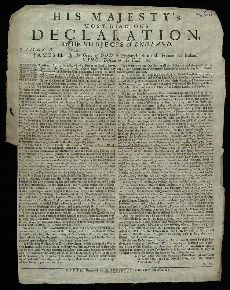 The Pretender’s declaration to England issued at the start of the 1715 Jacobite rebellion (TypBP.D15FJL).