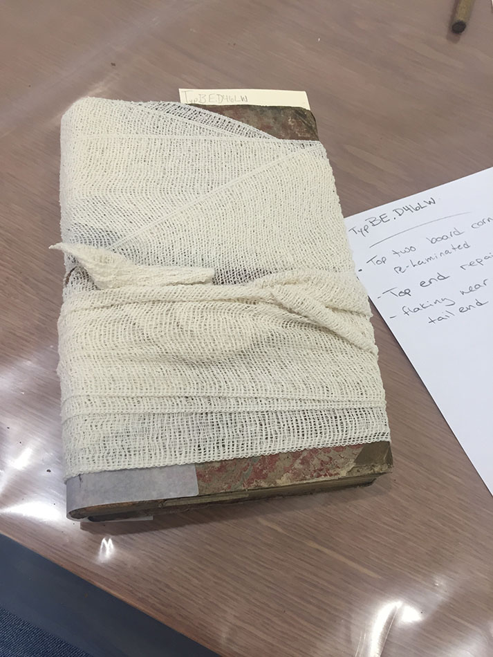 Some of us were lucky enough to carry out repairs on the spines of the books. After investigating if the book had a tight or hollow spine (very important) we could then repeat the process we had used for repairing loose material, by pasting, pressing and going over our work with baking parchment and a bone folder. After completing a spine repair, the book needed to be bound tightly in bandages until the paste had dried.