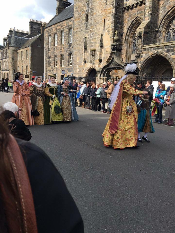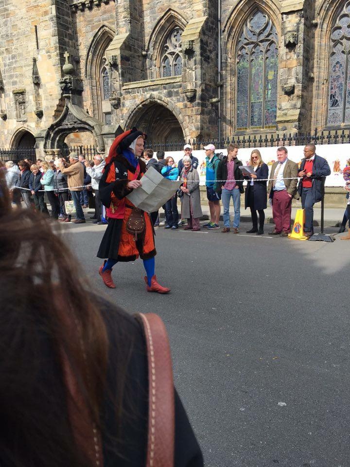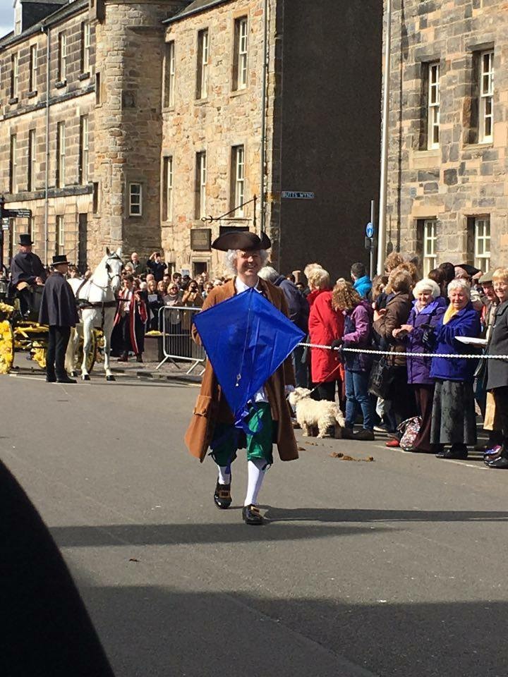 After the doors closed on the display, the current members and some old friends of the club went off to dress for the procession. To the accompaniment of pipe bands, bells from St Salvator’s Chapel and the carillon of Holy Trinity church, the story of the town and University was re-told once again in the traditional celebration of the arrival of Spring. A new Kate Kennedy was chosen from aspiring bejants and Archbishop Sharp was murdered many times as his carriage passed through the streets! There were some beautiful new costumes, new characters and some new heraldry this year, and some of the parts in the procession were taken by Friends of Special Collections. Of particular note from the early history was Henry Ogilvy, bearer of the papal bulls from the Pope in 1414 and Bishop Wardlaw, played with aplomb by Dr Barbara Crawford. Barbara, as Chair of the Strathmartine Trust, was behind the erection in 2013 of the magnificent bronze statue commemorating Wardlaw which sits in St Mary’s quadrangle. Frank Quinault also made a magnificent bishop. Mary Queen of Scots walked this year, instead of riding, and was accompanied by her four Marys and a lute player. Graeme Scott once again diligently manipulated his bones as Napier of Merchiston, Benjamin Franklin carried the kite which was instrumental in his experiments with electricity, for which he was awarded a St Andrews LLD in 1759, and the Club archivist, Hilaire, became a very dapper Sir Hugh Lyon Playfair. Robin Evetts once again very convincingly evoked Principal Sir James Irvine and John Matthews portrayed Sir James Black, a new addition to the parade.