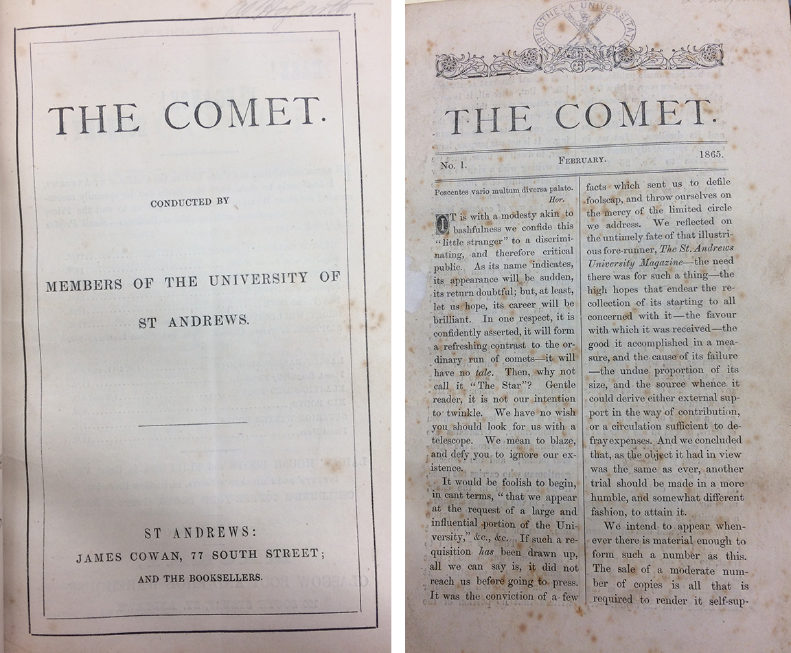 In his opening words, Mill set the pattern for the activity, or lack of it, of successive Rectors, until the election of the Marquis of Bute in 1892. He defined the role as ‘the honorary presidency of your University’. He was never a working rector, but rather an eminent man with whom the University students wished to be associated: ‘a man whose literary fame would shed lustre and dignity on any society with which he was connected’ (The Comet, issue 1, November 1865 StA LF1119.A2C71). However, in a statement ahead of its time, that same article in The Comet continues with the wish of the students to see the rector acting as representative of those who elected him. As a supporter of the rights of women, JS Mill would have been delighted to see a female Lord Rector succeeding him, but might have been less sanguine about her exercise of the primary representative role of the active University Rector today.