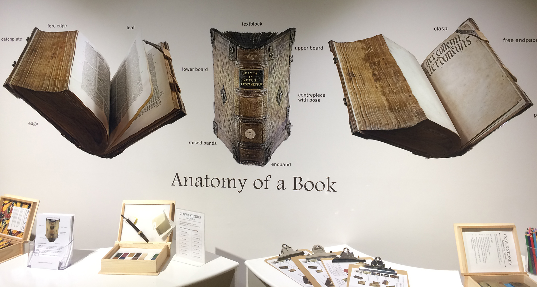 The visit was topped off with a tour of the ‘Cover Stories’ exhibition, curated by Jane, which featured some beautiful bindings from the Library’s collections and some innovative engagement ideas. We were made to feel very welcome and were very envious of many aspects of the library, and interested in how it differed from St Andrews – not least that the automated book return sortation device, with its robotic action, was visible through glass walls in the entrance hall!
