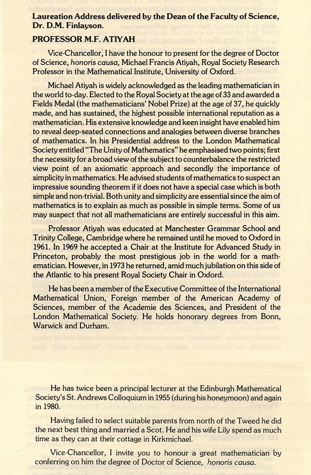 The eminent mathematican, Professor Michael Atiyah was awarded the Honorary Degree Doctor of Science (DSc) in 1981. Obtaining his BA in 1952 and doctorate in 1955, both at Trinity College, Cambridge, Professor Atiyah was elected to the Royal Society at the age of 33 and won the prestigious Fields Medal in 1966. Dr Finlayson’s laureation address, held by the Special Collections Division of the University Library, praises Atiyah’s insight, his understanding of the connections between the diverse branches of Mathematics and quotes from Atiyah’s address to the London Mathematical Society in which he stressed the importance of a broad view of the subject and the simplicity of mathematics: