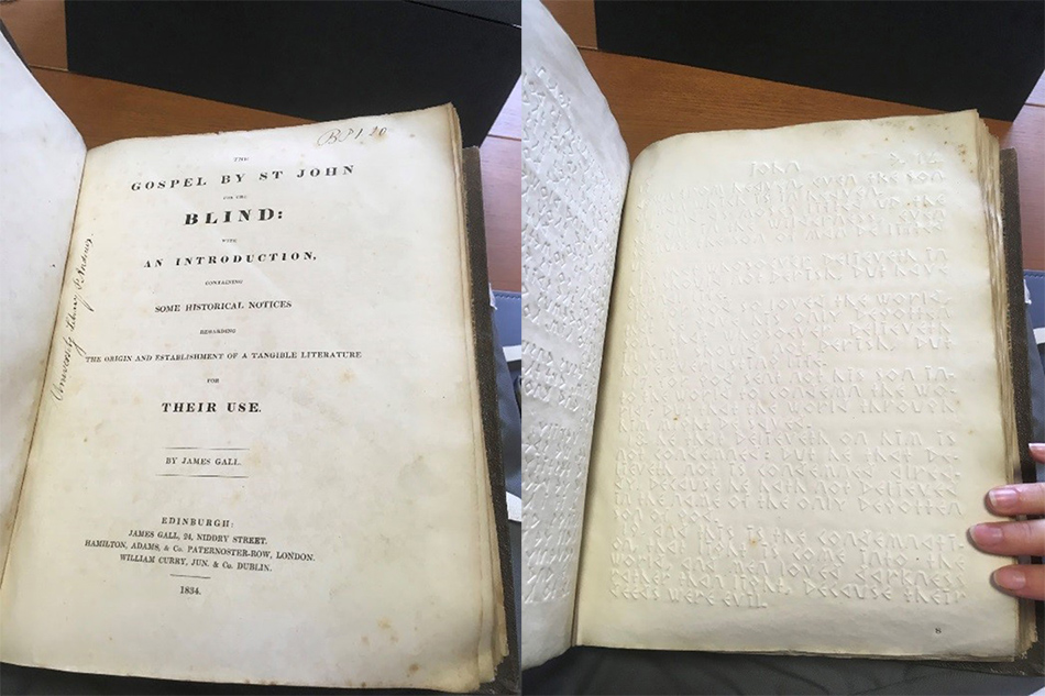 One of our favourite finds from the Bible Collection was this version of The Gospel of St John in a precursor to braille. Designed by James Gall, the alphabet used is a type of embossed writing called the triangular alphabet, which Gall brought to Britain in 1827. Each letter is slightly raised off the page and while most of the letters resemble our Latin alphabet, a few of the more curved letters, such as g, have been adapted so that they are easier to recognise through touch. The similarity of this angular alphabet to the Latin alphabet had the advantage that people who had been able to read before going blind could merely learn the alphabet and start reading fluently almost immediately. Even for members of the blind community who had never learnt to read or had never been able to, the simplicity of the triangular alphabet meant it was easy both to learn and teach. Gall hoped his language would contribute to the greater project of widening access to literature and particularly the bible for a whole community. While Braille has since become the preferred method of printing for blind readers, it was fascinating and even inspiring for us to experience a very early attempt of improving access to the written word.