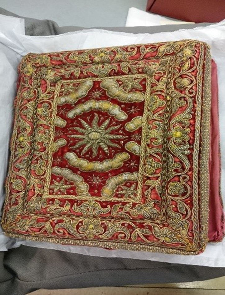 Also whilst searching through the Bible Collection, we came across a couple of boxes. Housed alongside the other books, boxes provide a little extra mystery as you never know what you will find inside and we always look forward to the shelves where we’ve spotted some. Inside both boxes were books with beautifully embroidered bindings, and we just had to do some research into why such lovely covers weren’t more commonplace!
