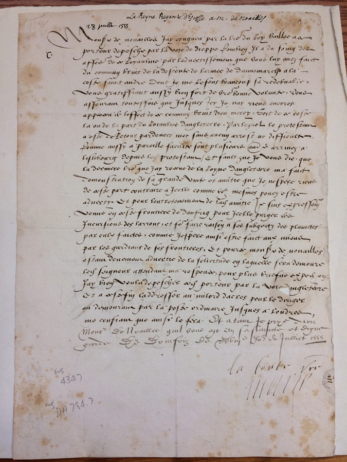 Dr Vicky Turner’s French honours class were able to see some French manuscripts and rare books, including a 1558 printed book of hours and a letter from Mary of Guise to Antoine de Noailles, dated 28 July 1555.