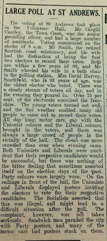 In this final blog for this week we are presenting evidence of the local impact of the extension of suffrage, through some of the St Andrews Citizen coverage from the time of the General Election of 14 December 1918, and of the first General Election in which women could vote on equal terms as men in May 1929.