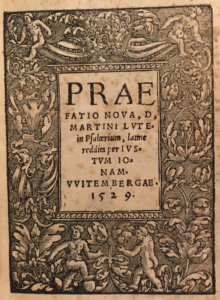 The University of St Andrews Library Special Collections, one of our partnering libraries and our home institution, has a great example. They have a 1529 edition of Luther’s preface to the Psalter, Praefatio nova, D, Martini Lvte. in Psalterium, latine reddita per IVSTUM IONAM (TypGW.B29XL), translated into Latin by his colleague Justus Jonas. Interestingly, this 1529 translation only included the preface; the actual Psalter text was not included. There are no other known editions of the preface printed by itself during Luther’s lifetime and the St Andrews copy is the only extant copy. It is not listed in the German national catalogue, VD16, nor in any of the major bibliographies, such as Josef Benzing’s Lutherbibliographie or Knaake and Aland’s Hilfsbuch zum Lutherstudium.