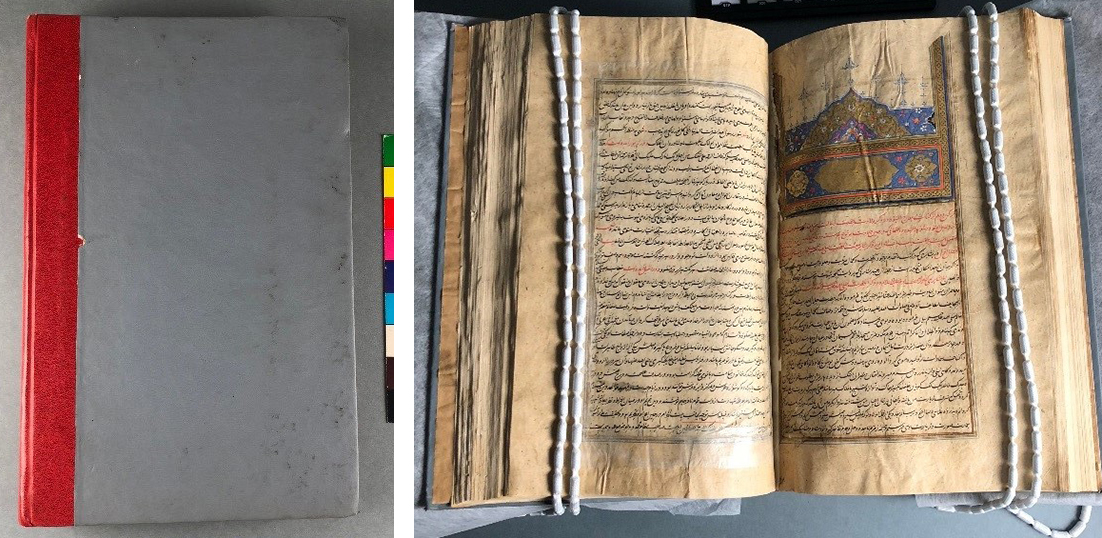 To inform the treatment proposal and methodology, it was important to understand the techniques and materials used in creating the manuscript, so I met with Persian specialist curators and conservators to discuss the techniques and the adaptations used at the time of the Qajar dynasty. It was interesting to learn that the manuscript developed during the era of establishment of Dar Al Funun, the first modern university in Iran, and that the book is characterized by unique features that are unprecedented in Islamic bookmaking, abstractly anti-Persian, and relatively modernised.