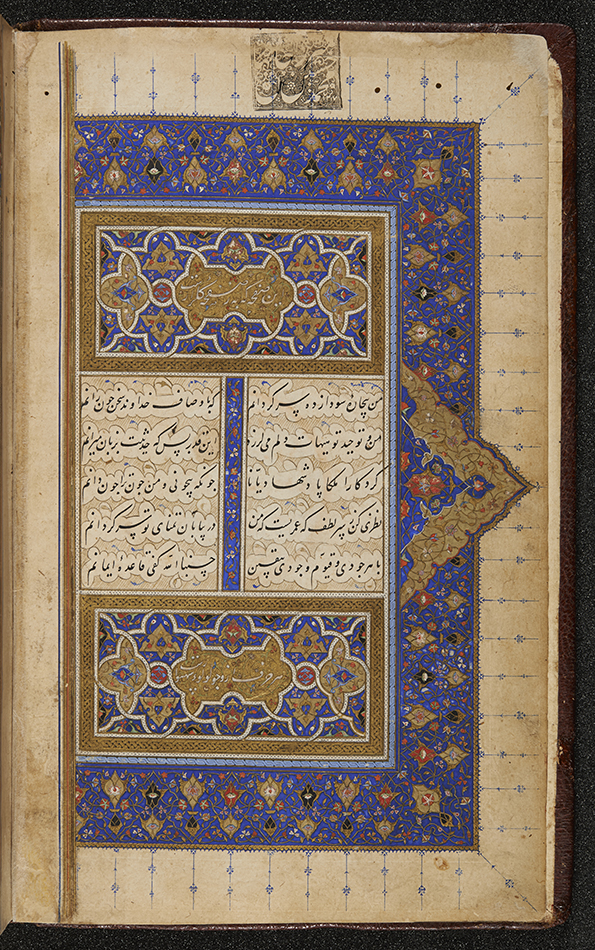 This late 17th century volume of mystical Sufi poetry by Moein al-Din ‘Ali Hosseini Sarabi Tabrizi (AH 757/AD 1356- AH 837/AD 1433), is beautifully illuminated with borders in blue and gold. This copy by Pir ‘Ali Jami, in the first days of Sha’ban, is from the royal library of Abu’l-Mozaffar Soltan Hosain Bahador Khan, the last Safavid king (1694-1722). The last owner of the volume, Eqbal al-doleh, dedicated the copy to William Tweedie in Baghdad 14 June 1883 (8 Shaban 1300). There are also single verses and robaeis by Halati Torkamani (died in 1592).