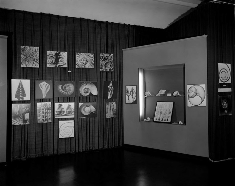Looking at the installation shots and realizing how many references the exhibition held to new theories in the natural sciences, technology, and the arts, it becomes clear why the exhibition was so extremely popular at the time. After the opening of the exhibit in the Fogg Museum on 16 February 1943, Warren sent a telegram to D’Arcy stating: “My exhibition great success, helped inspired by your superb growth book and your generosity.”[9] Edward Forbes, the director of the Fogg Museum, congratulated Warren on the favorable criticism in the newspaper the day after the opening.[10] A report from the educational department of the Boston Museum of Fine Arts, where it was featured in the summer of 1944, furthermore states that up to fifty visitors came to the gallery talks offered during the “shell exhibition” – as opposed to between two and twenty-five visitors during other shows – that six drawing classes were offered for 150 pupils, thus reaching new heights in registration, and that the lectures held on the topics such as “Art and Nature” attracted up to 125 visitors as opposed to the average 65.[11]