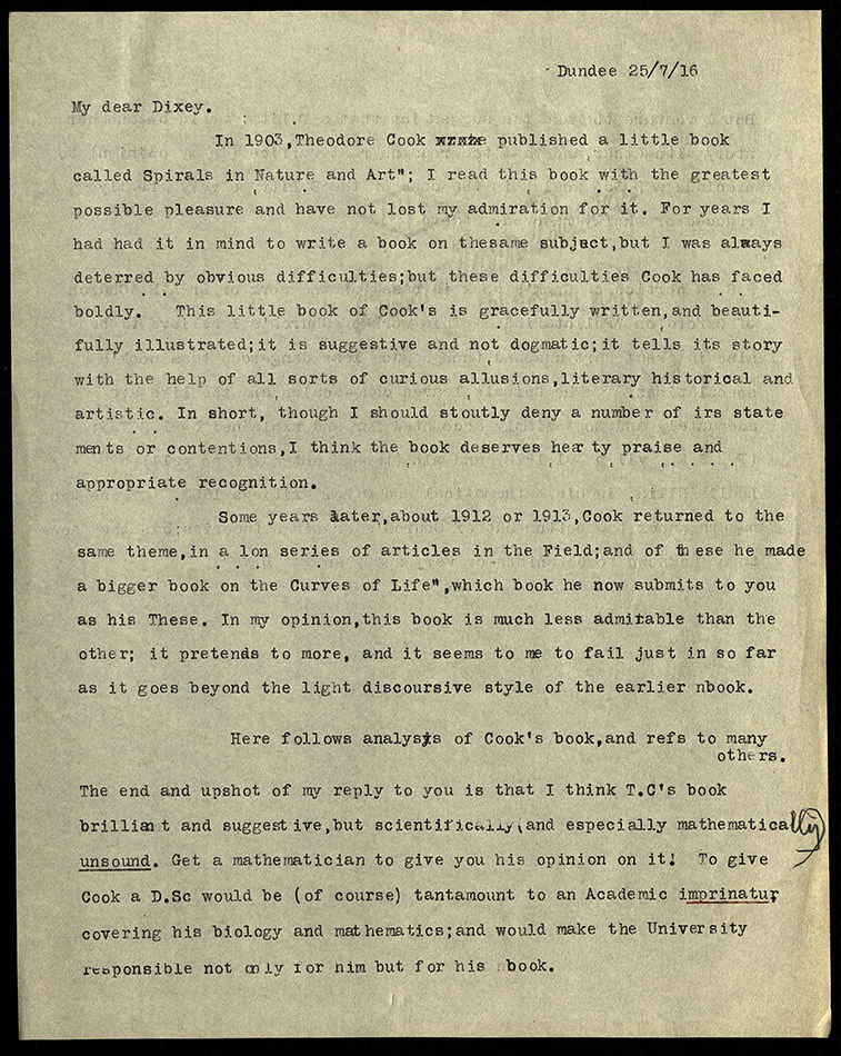 One of the installation shots indeed shows how D’Arcy’s diagrams of logarithmic and Archimedean spirals were integrated into the exhibition (Fig. 6). Their placement in the immediate vicinity of sections of seashells prompts a formal comparison arranged to give maximal visual evidence for the existence of mathematically explicable laws of growth in nature. This thesis, so central to Thompson’s book, is further supported by photographs showing how the logarithmic spiral recurs in various, not even closely related species, appearing as a universal principle of growth under the action of identical physical forces. The comparison of the logarithmic spiral in seashells with the horns of the Marco Polo and the Argali sheep is in fact also taken from D’Arcy’s On Growth and Form (Fig. 7), who in turn borrowed this example from the art critic Theodore Cook and his book on Spirals in Nature and Art (1903), which is also mentioned in the bibliography of Warren’s exhibition, along with Cook’s second, greatly expanded book The Curves of Life (1914). D’Arcy had praised Cook’s Spirals in Art and Nature in a letter to Harold Giles Dixey of 1916 (Fig. 8), writing that he read it with the greatest pleasure, having for years had in mind to write a book on a similar subject (which was to become On Growth and Form), but also stating that, for his taste, Cook had taken certain analogies too far, to the extent of becoming “scientifically (and especially mathematically) unsound”.