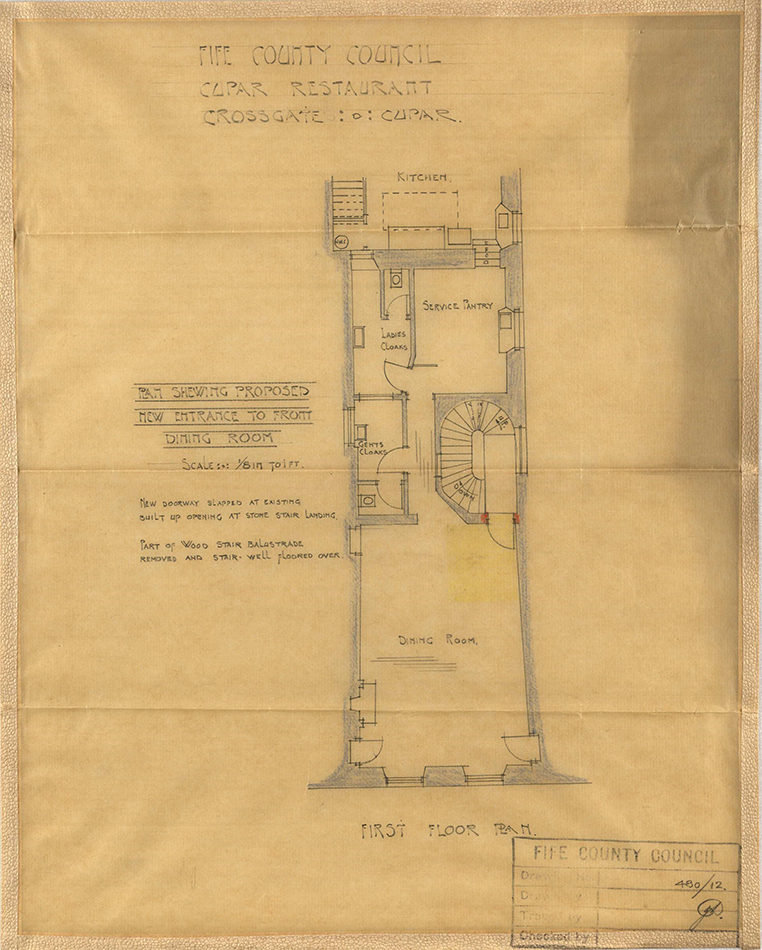 I know everyone is busy at this time of the year and so I thought I would share with you a couple of items on just one interesting subject I have found while browsing through the collection. We have a box of minor warrants and accompanying plans for alterations to different properties. One of them relates to the Second World War era when the British Government set up food centres called “British Restaurants” for those people who had had their homes bombed, leaving them without anything, or for those who had no ration coupons left. The images below relate to a planning application submitted by Fife County Council to the Royal Burgh of Cupar in 1942 for altering a building at Crossgate, Cupar for this purpose. Do you know the building involved, I wonder?