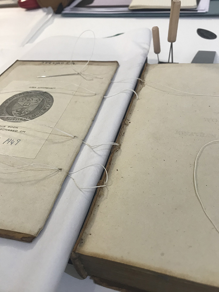 A tour around the rare books in the Library’s Special Collections reveals many volumes with bands of cotton tape tied around them. The white tying tape serves to warn staff that the ‘tied’ volume is physically damaged in some way and therefore requires extra careful handling, if it is stable enough to be handled at all.