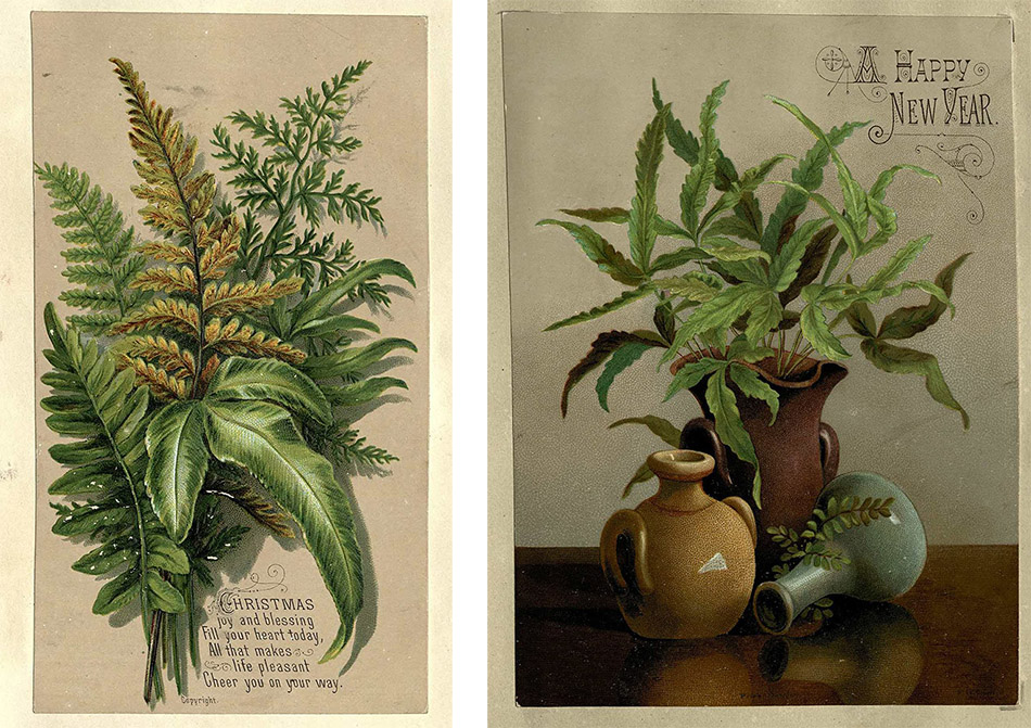 There’s the creative use of ferns by the McIntosh sisters, inveterate keepers of scrapbooks but also educated naturalists, using real ferns in collage and also fern paper cutouts in these cards:
