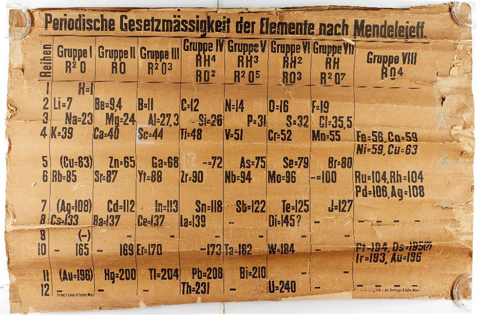 All the evidences seemed to point to the quest’s going in the right direction. However, to be totally certain that the purchase described in the voucher as ‘wallchart from Mendeleev’ matched exactly the table found in St Andrews it became essential to search a Gerhardt catalogue from the period, hoping that it would contain a periodic table with a description that would match that of the Old Table.