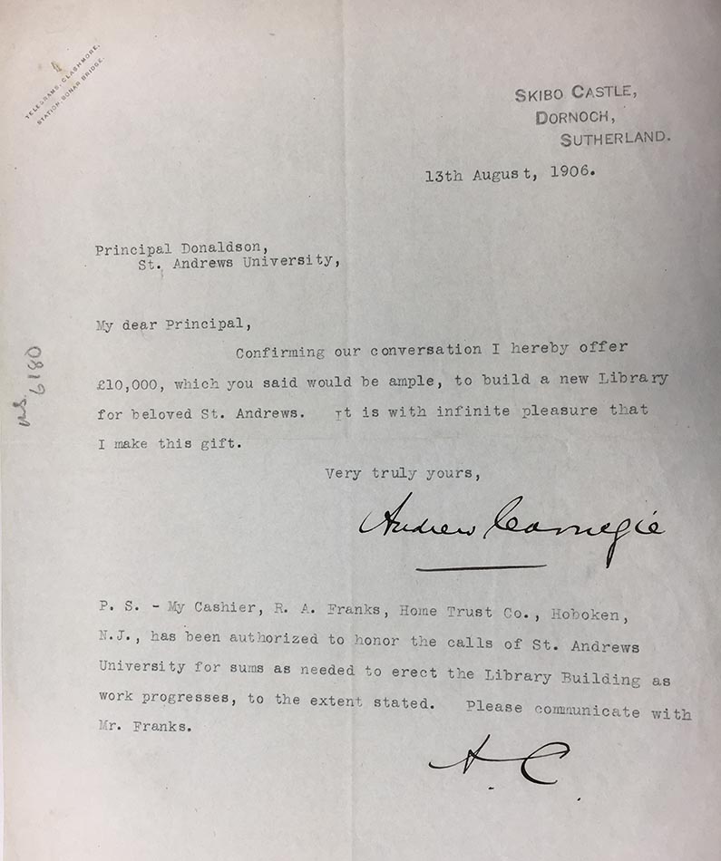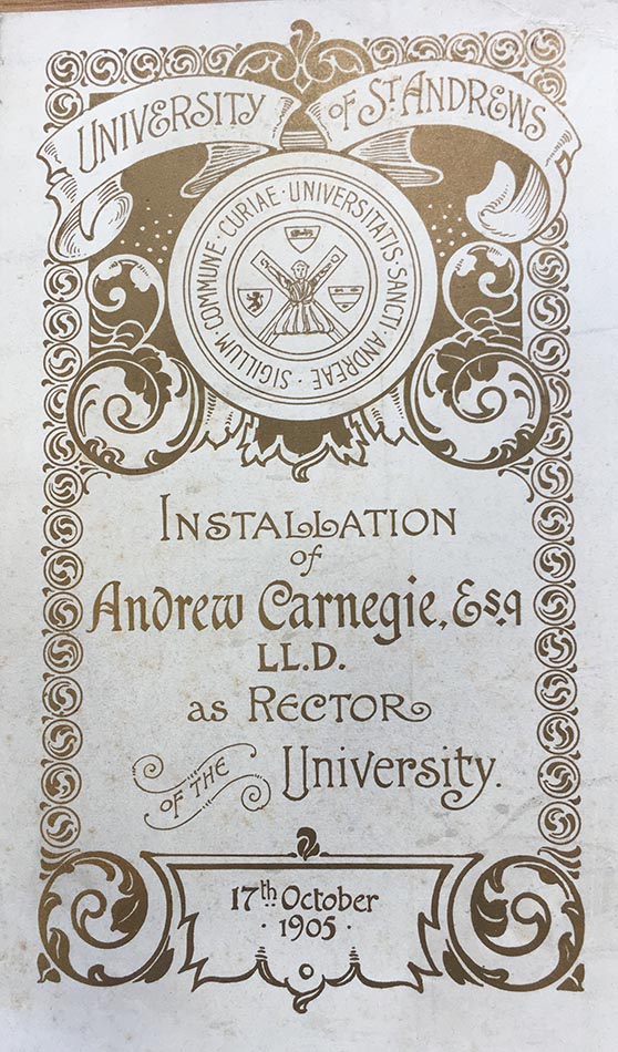 “We cannot forget that a man born in Scotland and reared in America has been both a Lord Rector of St Andrews University and the honored founder of this institution.” (UYUY185/5/5/1)