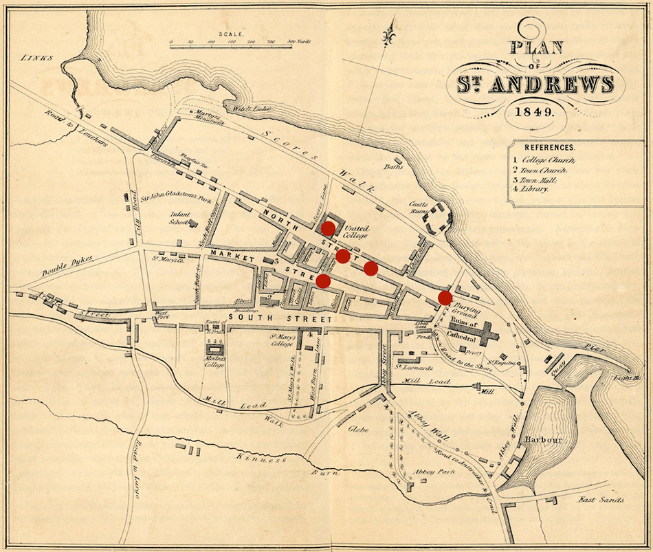 By 1860, North Street had undergone considerable transformations under Hugh Playfair’s tenure as Provost, including the addition of a pavement on each side. To the right can be seen the Episcopal Chapel, built in 1825 in the Gothic Revival style and now replaced by the College Gate building. When this composition was framed, its minister was the Reverend Charles Jobson Lyon, who wrote two books about the history of St Andrews. The congregation outgrew the building in the 1860s and the chapel was sold to the Free Church congregation in Buckhaven. The building was dismantled and the stones were transported by sea to Buckhaven where it was rebuilt. The congregation moved to the larger Saint Andrew’s Episcopal Church at the bottom of Queens Terrace, which was consecrated in 1869.