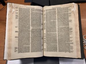 This volume was rebound in the 19th century, the leather cover featuring detailed tooling as well as gold along the spine. The end papers are made of marbled paper, but the original paper sheets have not been trimmed, all signifying that the owner at the time recognised the work’s importance. The book does not have many notes or writing in it, which also speaks to its value. It could also hint to the fact that it was possibly not read much or alternatively was cleaned well during the 19th century. The book is quite large, with the sheets not only having two large columns of text but also a great deal of white space present. The amount of blank space on the pages mean this would have been quite expensive. Not meant to be portable, the large size of the volume means that it would have sat in a study or library and the owner would not have had to be secretive about its possession; a book this size would be quite difficult to conceal!