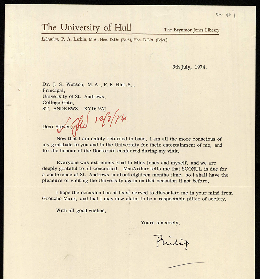 Larkin’s letter of thanks to J Steven Watson, Principal and Vice-Chancellor 1966- 1986 is held in Special Collections. In the letter, Larkin refers to the kindness extended to ‘Miss Jones’. Monica Jones was the most consistently important figure in Larkin’s life. She was his confidante and frequent—and finally sole—companion, from the late 1940s until his death.